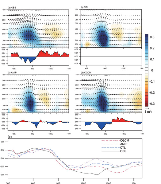 图 2 观测(a)和三组回报试验中(b-c)Lag-0回归的10N-10S水汽异常(阴影)和纬向、垂直风异常(矢量)的垂直剖面图;每张图下方的折线表示MJO相关的海温距平分布。(e)观测和回报试验中赤道经向平均(10N-10S)的850hPa纬向风异常随纬度分布图。