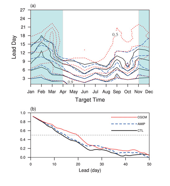 图 1 三组回报试验中MJO预测技巧。(a)不同月份距平相关系数随预测时间的变化;(b)北半球冬季(11月-次年4月)距平相关系数随预测时间的变化