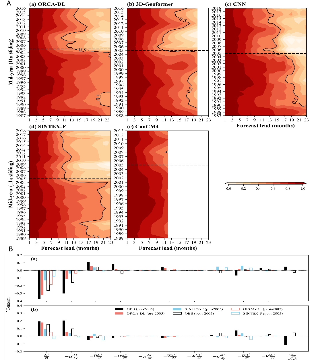 研究表明,无论深度学习模型还是动力模式,均可以表征ENSO预测技巧的年代际变化(图1)。自2005年开始,ENSO的预测技巧均出现显著下降,尤其体现在对ENSO相位转变(如El Niño转La Niña,或La Niña转El Niño)的预测能力上,这导致了ENSO春季预报障碍的增强。研究进一步揭示,2005年之后,位相转换年的前一年夏季(JJA(-1))西太平洋次表层异常信号与ENSO海表温度异常之间的关联明显减弱,使得该信号不再作为ENSO位相转变的有效前兆信号。通过混合层热收支诊断分析,本研究指出在ENSO衰减和位相转换阶段,平均海温的异常纬向平流项起着关键作用(图B)。2005年后,多数模型对该项的预测出现显著偏差,这是导致ENSO预测技巧下降的重要原因之一。本研究得到国家自然科学基金(项目号:42030605与42088101)、气候系统预测与变化应对全国重点实验室自主课题(项目号:CPRM-2025-NUIST-012)以及江苏省研究生科研与实践创新计划(项目号:KYCX25_1586)的资助。
