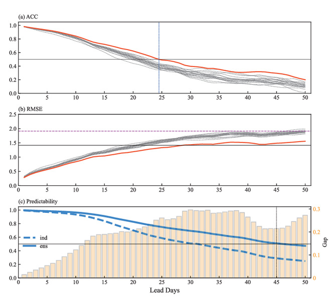 MJO是全球次季节至季节(S2S)尺度可预报性的重要来源,但其预测仍面临巨大挑战。我校博士伍继业,国家特聘专家罗京佳教授以及日本海洋研究开发机构(JAMSTEC)的Toshio Yamagata院士,Takeshi Doi最新的研究基于气海耦合模式和广泛使用的松弛逼近(nudging)方法,本研究探索了适宜的初始化和集合方案,旨在改进MJO预测。结果表明,采用扰动大气松弛系数的集合策略有助于产生充足的集合离散度,从而提高了预报技巧,尤其是针对弱MJO个例的预报。最终,建立了一个包含18个成员的次季节集合预报系统,命名为NUIST-CFS1.1。技巧评估表明,NUIST-CFS1.1能够将MJO的有效预报时效延长至24天,这已达到世界平均水平,但距离估算的潜在可预报性(约45天)仍有较大差距(图1)。