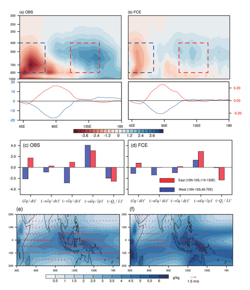 图 2 基于(a)观测和(b)50年FCE数据的TEIO区域平均的20-100天带通滤波OLR距平Lag 0天回归的20-100天带通滤波赤道(10°N-10°S)平均比湿趋势(填色,单位:10-10 kg·kg-1·s-1),蓝色和红色虚线框分别表示MJO深对流的西侧(10°N-10°S, 40°-75°E)和东侧(10°N-10°S, 110°-150°E)区域,每张子图下面附着的为Lag 0天回归的20-100天赤道(10°N-10°S)平均的OLR距平(蓝线,单位:W·m-2)和850-400 hPa垂直平均比湿距平(红线,单位:g·kg-1)。基于(c)观测和(d)FCE数据的Lag 0天回归的对流层中层(850-400 hPa)平均水汽收支,蓝、红色柱状图分别表示对流西、东侧区域平均。